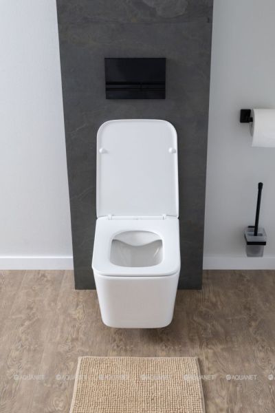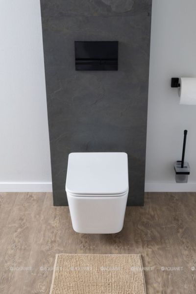 Современный подвесной унитаз Aquanet Rimless Tavr создан для компактных ванных и туалетных комнат благодаря своим габаритам 360х525х290 мм. Изготовлен из белой керамики, а в комплекте идет  удобная крышка-сиденье из дюропласта в тон устройству. Подвесная конструкция экономит место, делает пространство более технологичным и комфортным за счет размещения смывного механизма в стене. Снаружи вы устанавливаете аккуратную кнопку смыва с плавным нажатием. Дополнительные функции — режим антивсплеск и безободковое решение. В плане дизайна прямоугольный унитаз будто создан для стиля модерн, лофт, минимализм, хай-тек, эклектики и Скандинавии. Ваша задача — приобрести в дополнение хорошую инсталляцию для смыва, так как в комплекте с унитазом она не продается.