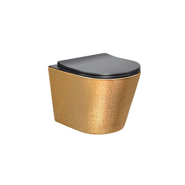 520х360х370Подвесной унитаз Vincea Piatti в черно-золотом исполнении – это эргономичное и элегантное решение для современной ванной комнаты. Унитаз изготовлен из высокопрочного фарфора. Внешняя часть чаши – покрытие золото с текстурой, внутренняя – глянцевый черный цвет, черная крышка. Унитаз укомплектован элегантным ультратонким быстросъемным сиденьем из дюроплласта с плавным опусканием черного цвета.