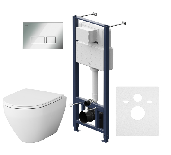 Полностью готовый к установке комплект: система инсталляции с клавишей, подвесной унитаз сиденьем.Не разборная рама из стального профиля выдерживает нагрузку до