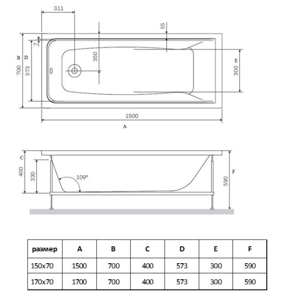 Ванна акриловая Vincea VBT-2G170-FR с каркасом 1700*700*470, пристенная, цвет белый купить