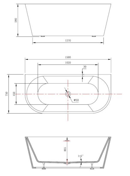 Ванна акриловая Vincea VBT-421-1500, 1500*750*580, цвет белый, щелевой перелив