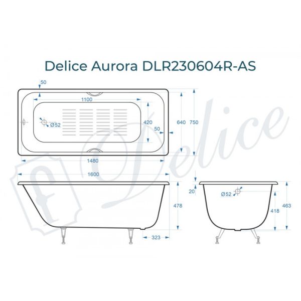 Ванна чугунная Delice Aurora DLR230604R-AS 160x75 с отверстиями под ручки и антискользящим покрытием