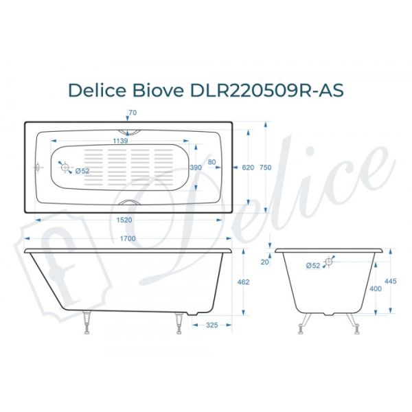 Ванна чугунная Delice Biove DLR220509R-AS 170x75 с ручками