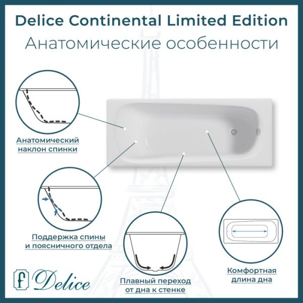 Ванна чугунная Delice Continental Limited Edition DLR230644-AS 165х70 с антискользящим покрытием купить