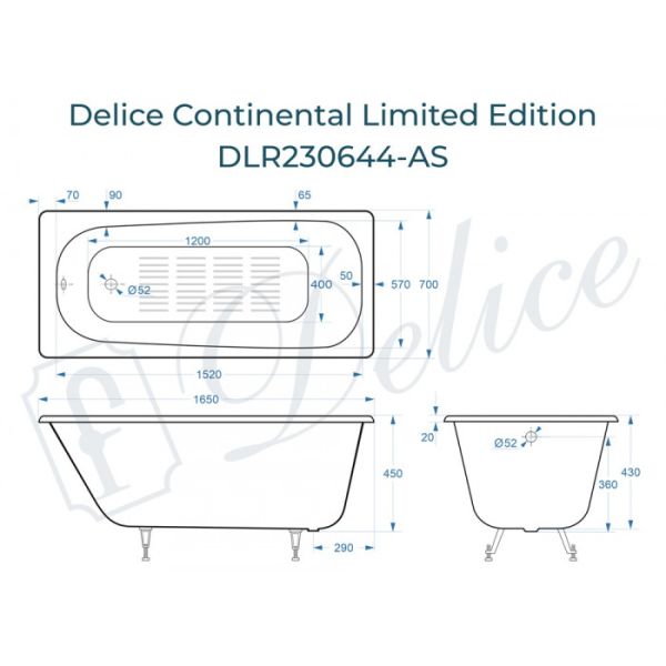 Ванна чугунная Delice Continental Limited Edition DLR230644-AS 165х70 с антискользящим покрытием