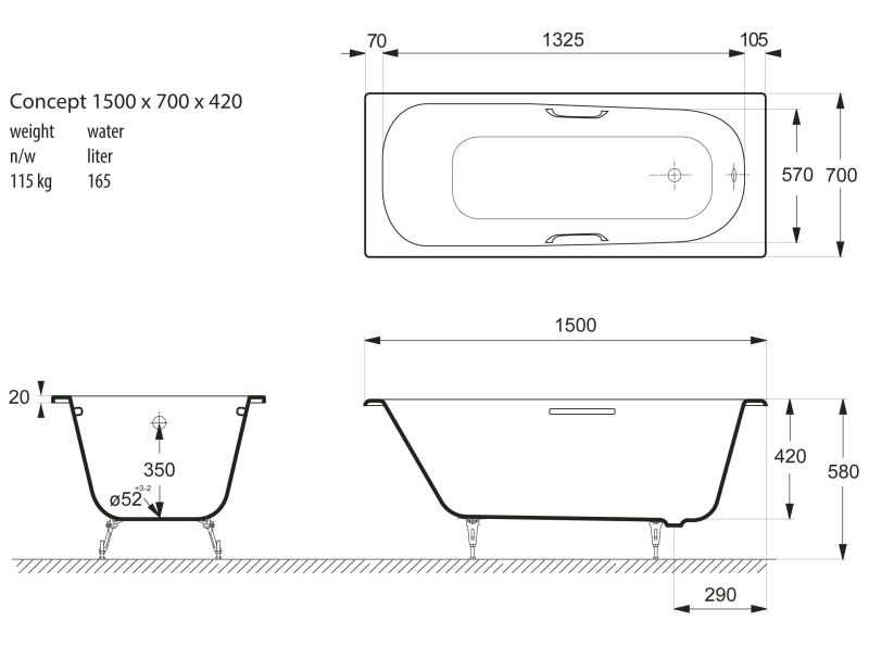 Общие характеристикиРазмер 150х70Длина 150 смШирина 70 смГлубина 42 смВысота на ножках 57 смПолезный объём 220 лВес 115 кгБренд Vinsent Veron7 слёв титановой эмали класса 1АЦвет эмали белыйБез антискользящего покрытияДиаметр слива Ø52Расположение перелива стандартное