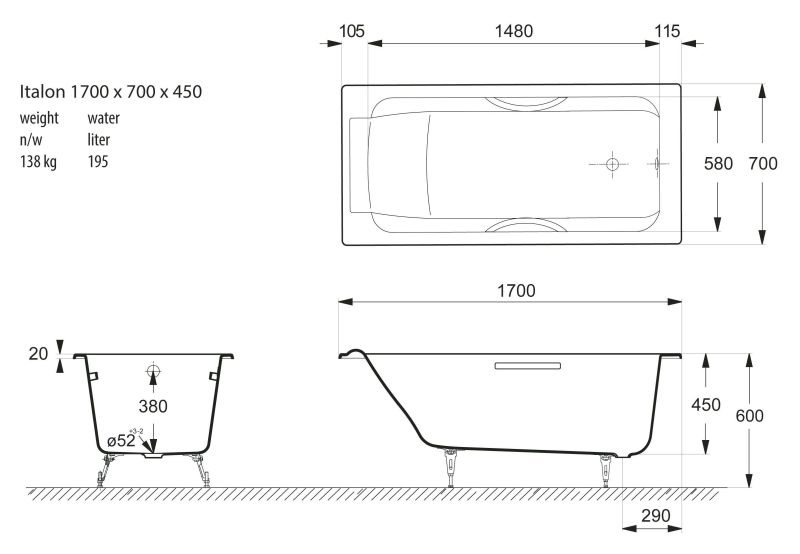 Общие характеристикиРазмер 170х70 Длина 170 см Ширина 70 см Глубина 45 см Высота на ножках 60 см Полезный объём 270 л Вес 138 кг Бренд Vinsent Veron 7 слёв титановой эмали класса 1А Цвет эмали белый Без антискользящего покрытияДиаметр слива Ø52 Расположение перелива стандартное