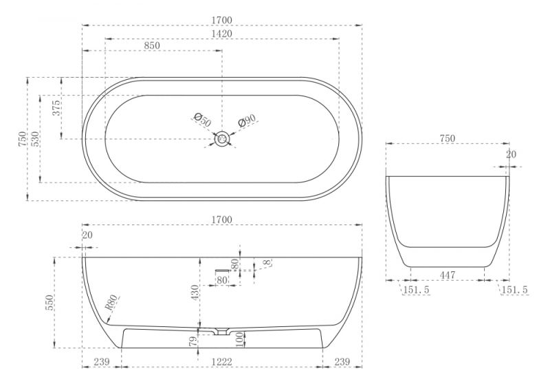 Ванна из искусственного камня ABBER Stein AS9613-1.7 170x75см белый матовый