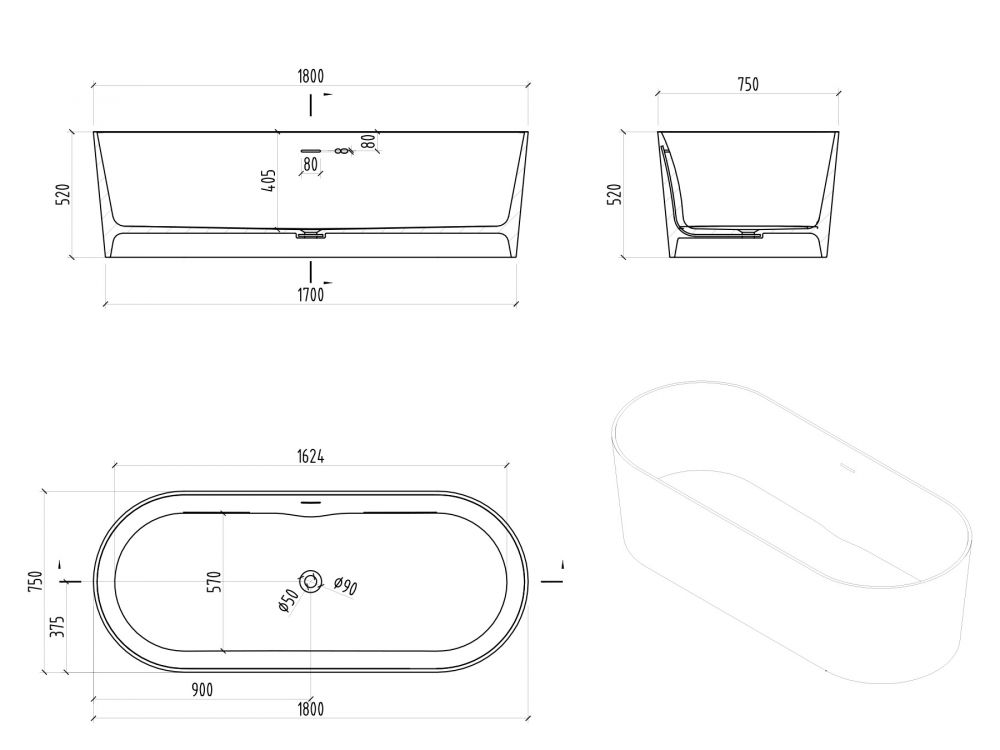 Ванна из искусственного камня ABBER Stein AS9614 180x75см белый матовый