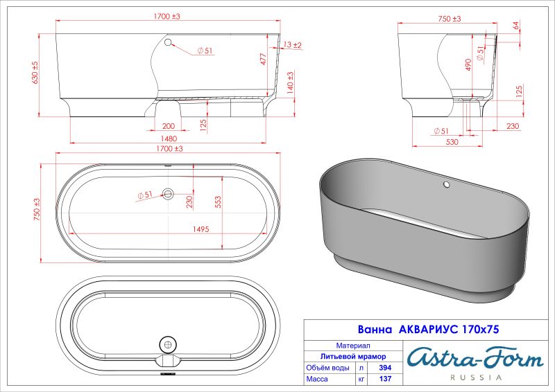 Ванна из искусственного камня Astra-Form Аквариус 01010045 170x75 см белый глянец