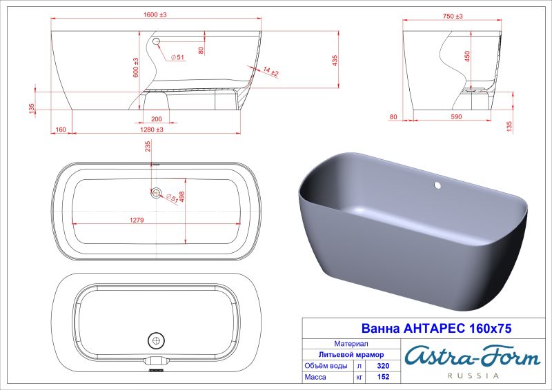 Ванна из искусственного камня Astra-Form Антарес 01010019 160x75 см белый глянец купить