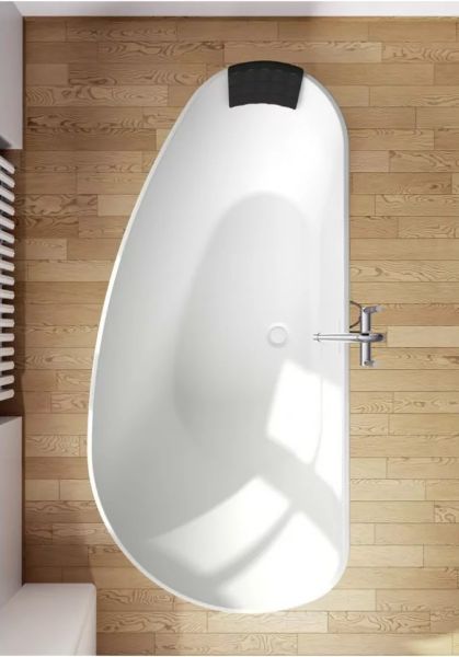 Отдельно стоящая, асимметричная ванна Solid Surface RIHO GRANADA 170 x 80 левая - композитная ванна, изготовленная из однородной каменной массы - каменная на ощупь, тёплая внутри. Это имитация мрамора: белый матовый цвет ванны при наполнении водой заиграет оригинальной текстурой камня.