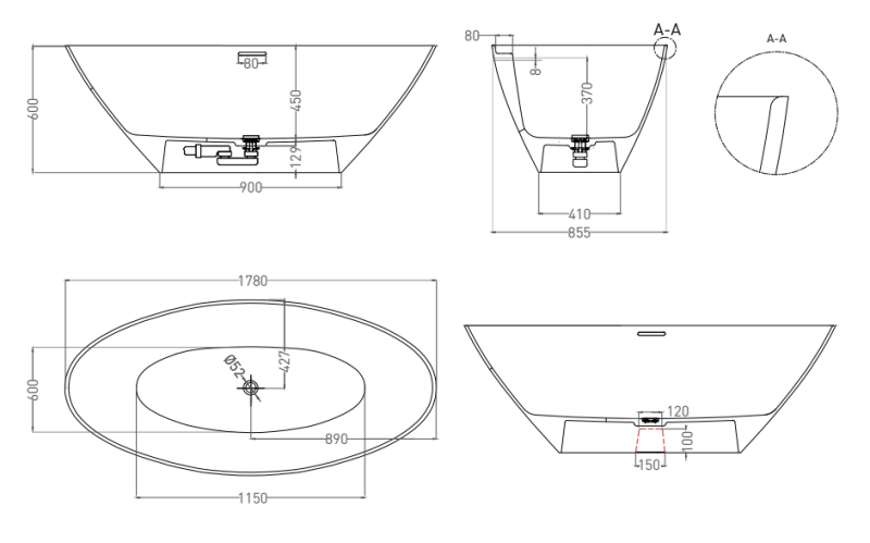 Ванна из искусственного камня Salini Diva S-Sense 102211GRH 178x85см RAL снаружи