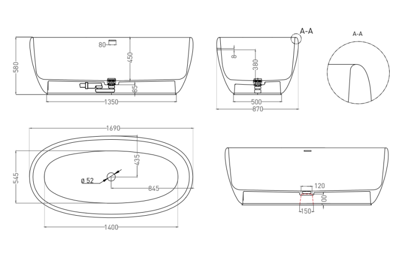 Ванна из искусственного камня Salini Luce S-Stone 100121MRH 170x85см RAL снаружи