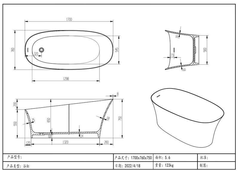 Ванна из искусственного камня Timo Kiara KIARA1700 170x76 см белый