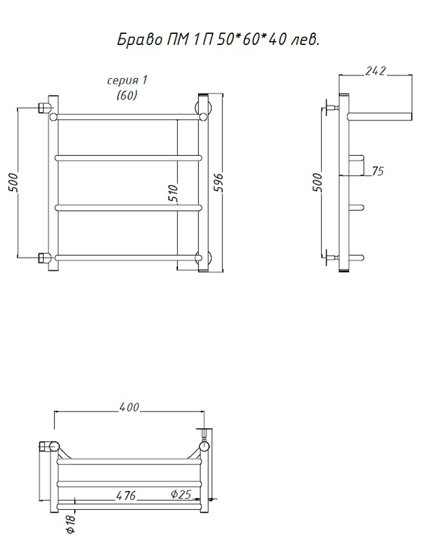 Водяной полотенцесушитель Тругор Браво ПМ 1 П 50x60x40см с полкой левый хром Браво1/ПМ506040Плев