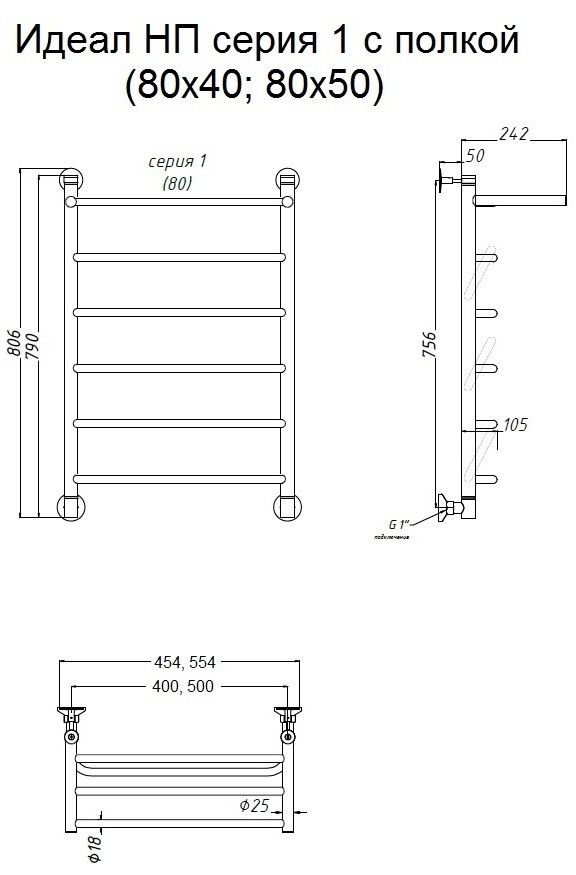 Водяной полотенцесушитель Тругор Идеал НП 1 П с полкой 80x50см хром Идеал1/нп8050П