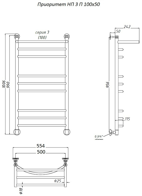 Водяной полотенцесушитель Тругор Приоритет НП 3 П с полкой 100x50см хром Приоритет3/нп10050П