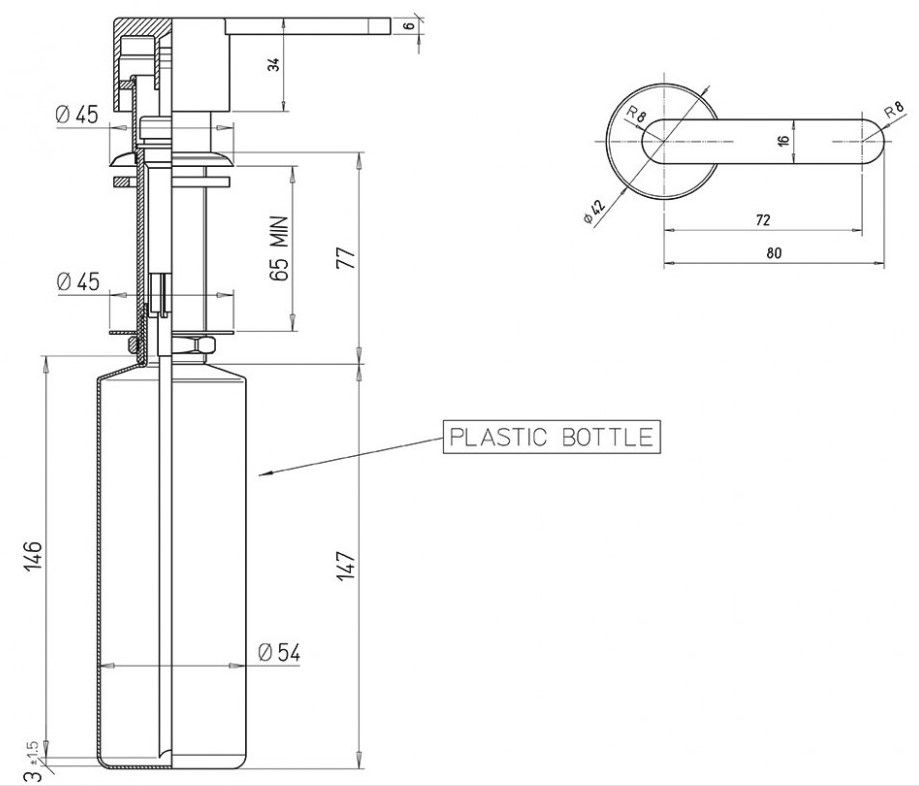 Дозатор для жидкого мыла или иного моющего средства PAINI. Дозатор встраиваемый для использования в ванной или на кухне. Объем ёмкости для мыла или моющего средства 0,5 л.