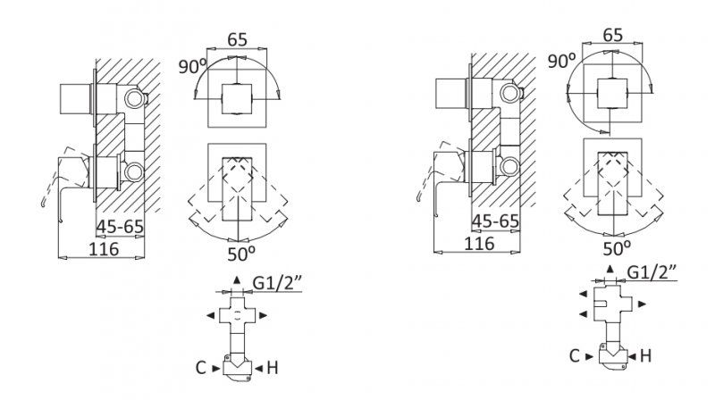 Оснащение: скрытая монтажная часть, дивертор поворотный