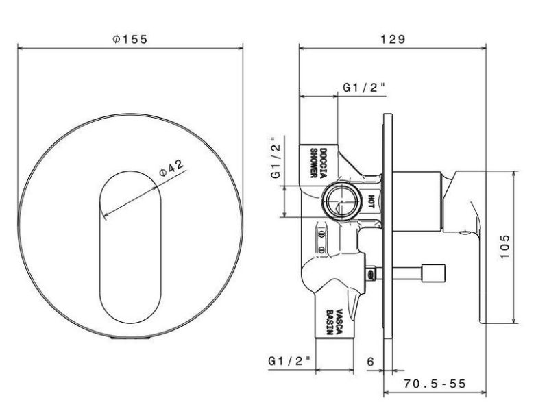 Встроенный однорычажный смеситель для душа с переключателем на 2 потока, соединение входа и выхода 1/2".