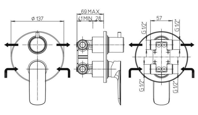 • Встраиваемый монтаж скрывает все соединения и оставляет на виду только рычаг управления, что добавляет в интерьер дизайнерский акцент, экономя пространство.
