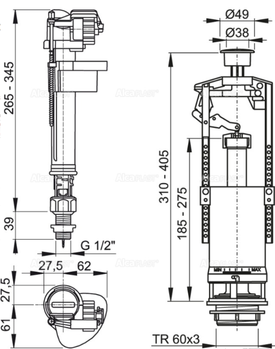 • Конструкция позволяет регулировать высоту механизма в зависимости от высоты бачка