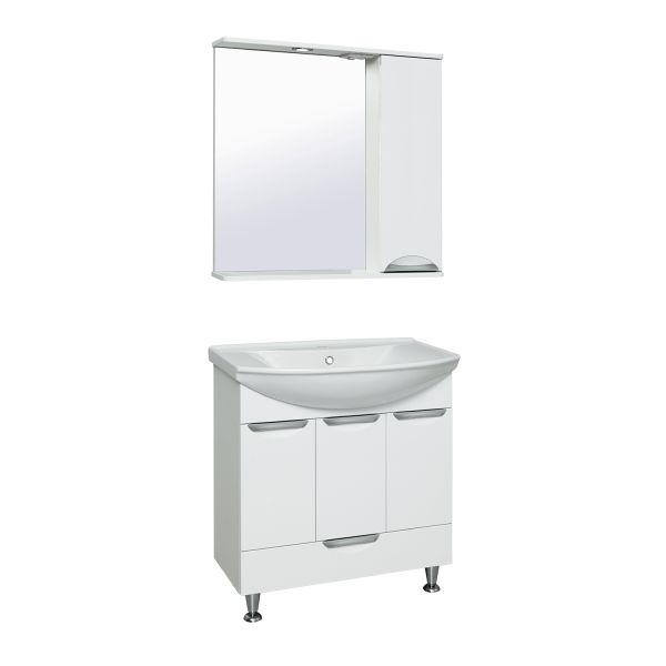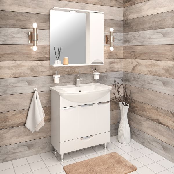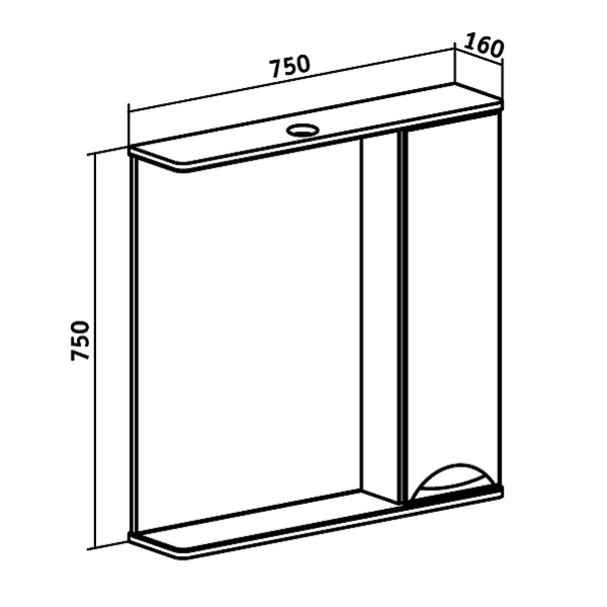 Зеркальный шкаф оборудован одним врезным светодиодным светильником 220В и розеткой с выключателем. Справа шкафчик с распашным фасадом, за которым две внутренние полки. Петли со встроенным доводчиком, ручка -1 шт. Выпускается только в правом исполнении.