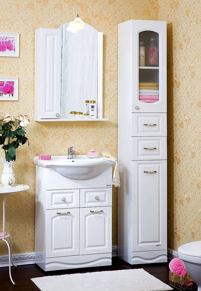 Внутреннее содержание шкафа умело организовано: разнообразные полки и отсеки позволяют удобно разместить все необходимые аксессуары – от косметики до бытовой химии. Зеркало, интегрированное в фасад, визуально расширяет пространство и облегчает утренние рутинные процедуры.