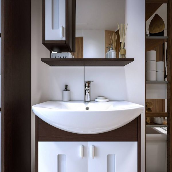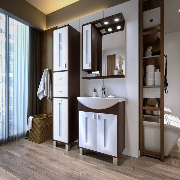 Внутреннее содержание шкафа умело организовано: разнообразные полки и отсеки позволяют удобно разместить все необходимые аксессуары – от косметики до бытовой химии. Зеркало, интегрированное в фасад, визуально расширяет пространство и облегчает утренние рутинные процедуры.