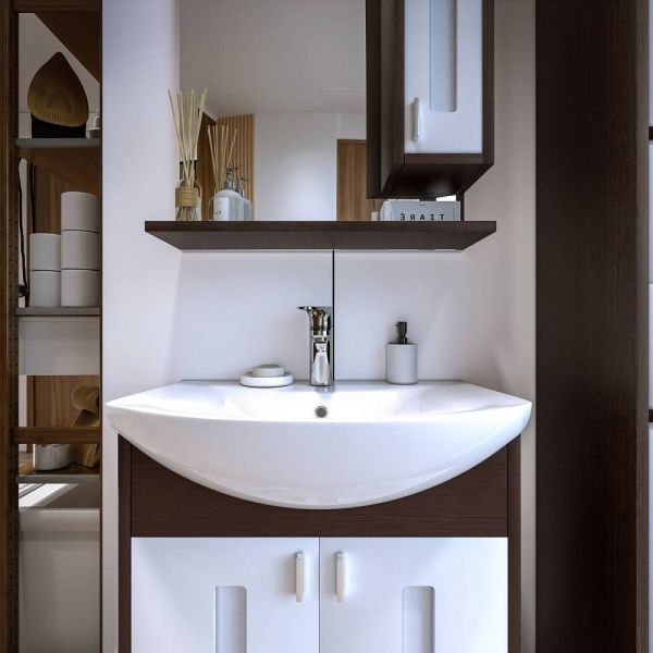 Внутреннее содержание шкафа умело организовано: разнообразные полки и отсеки позволяют удобно разместить все необходимые аксессуары – от косметики до бытовой химии. Зеркало, интегрированное в фасад, визуально расширяет пространство и облегчает утренние рутинные процедуры.