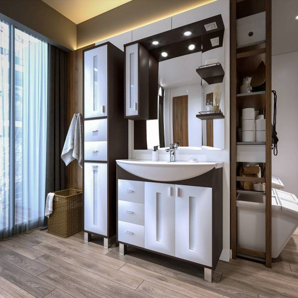 Внутреннее содержание шкафа умело организовано: разнообразные полки и отсеки позволяют удобно разместить все необходимые аксессуары – от косметики до бытовой химии. Зеркало, интегрированное в фасад, визуально расширяет пространство и облегчает утренние рутинные процедуры.