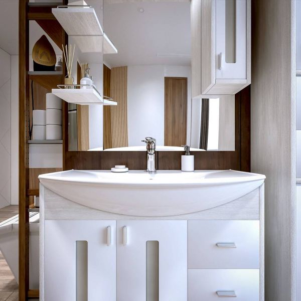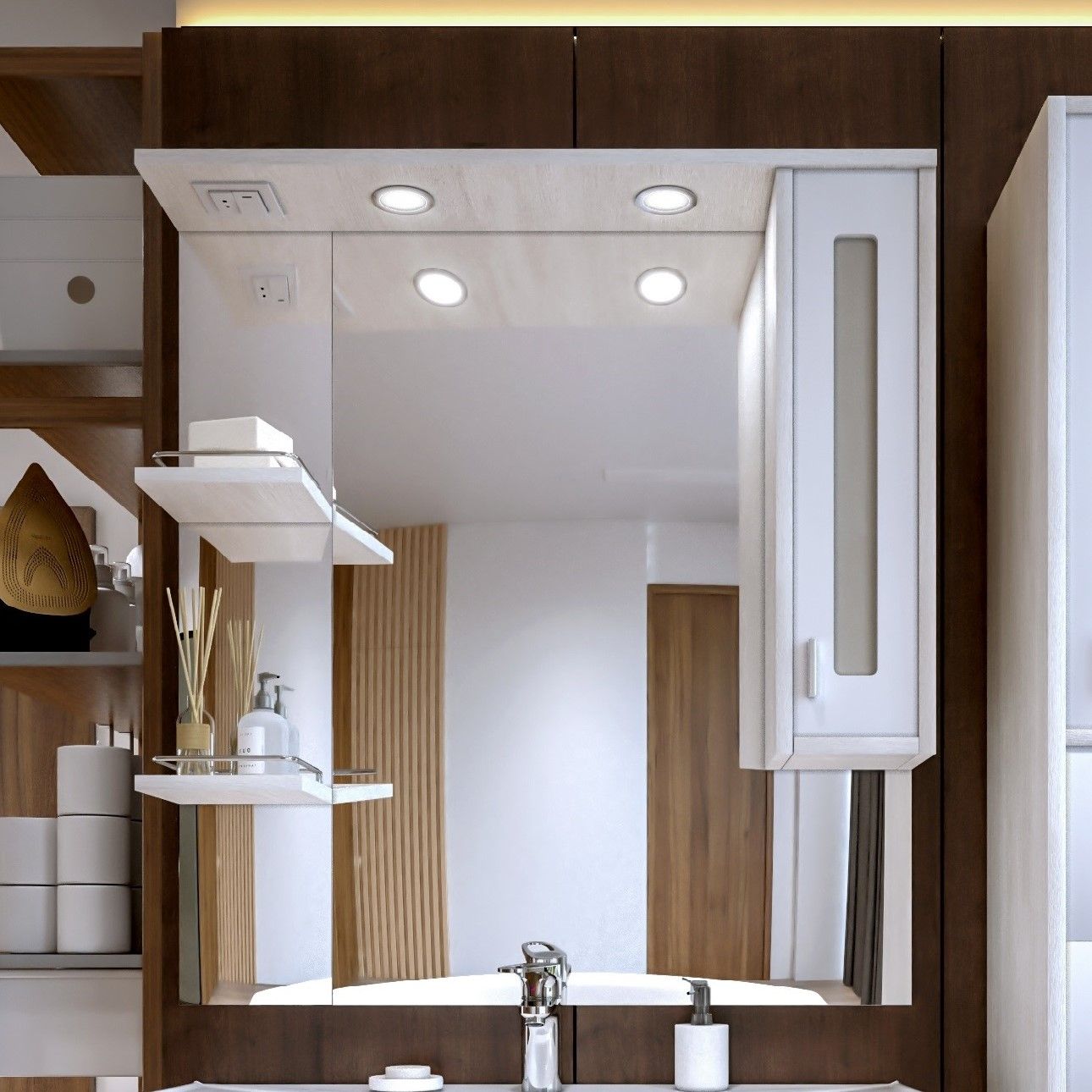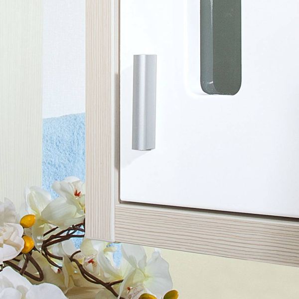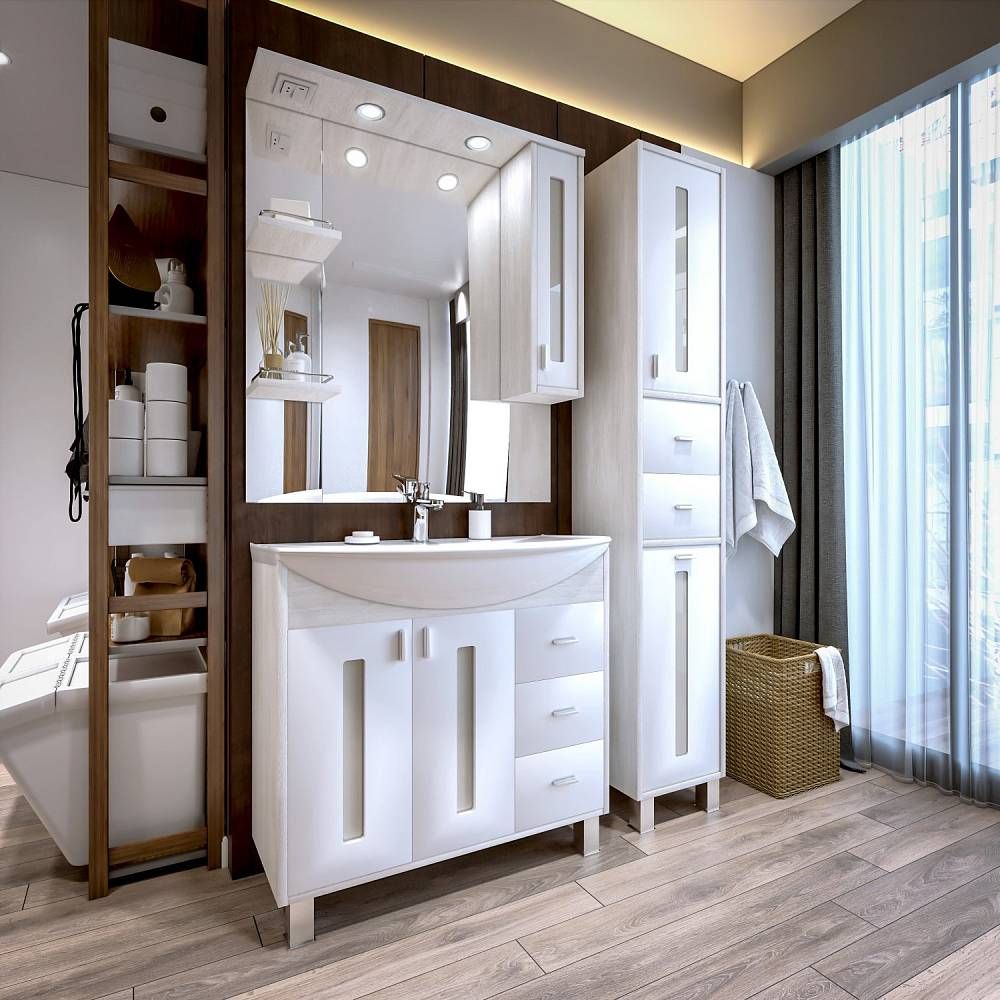 Внутреннее содержание шкафа умело организовано: разнообразные полки и отсеки позволяют удобно разместить все необходимые аксессуары – от косметики до бытовой химии. Зеркало, интегрированное в фасад, визуально расширяет пространство и облегчает утренние рутинные процедуры.
