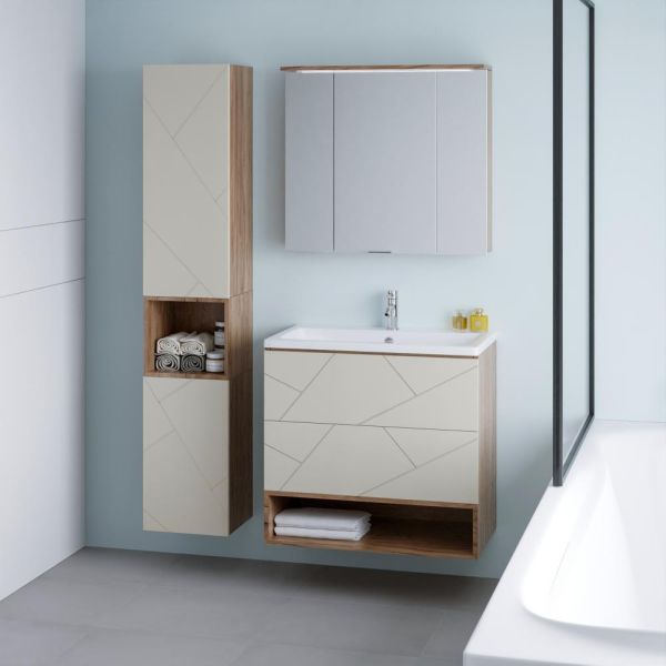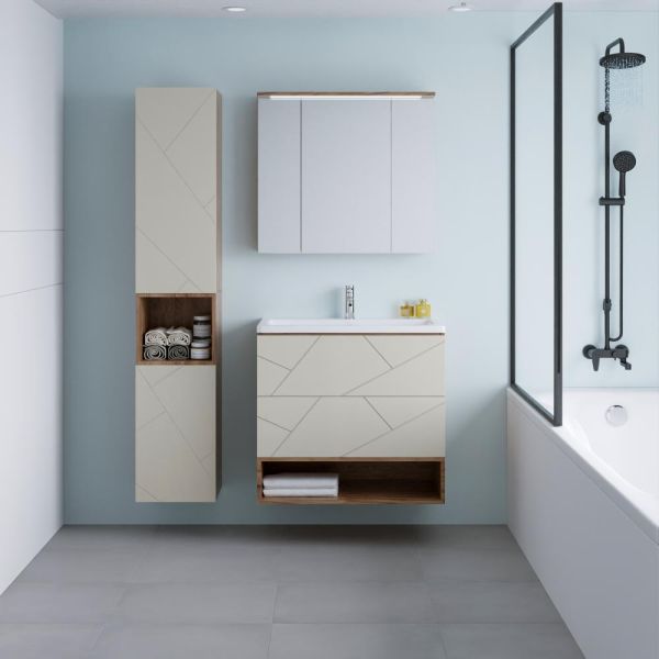 Внутреннее содержание шкафа умело организовано: разнообразные полки и отсеки позволяют удобно разместить все необходимые аксессуары – от косметики до бытовой химии. Зеркало, интегрированное в фасад, визуально расширяет пространство и облегчает утренние рутинные процедуры.