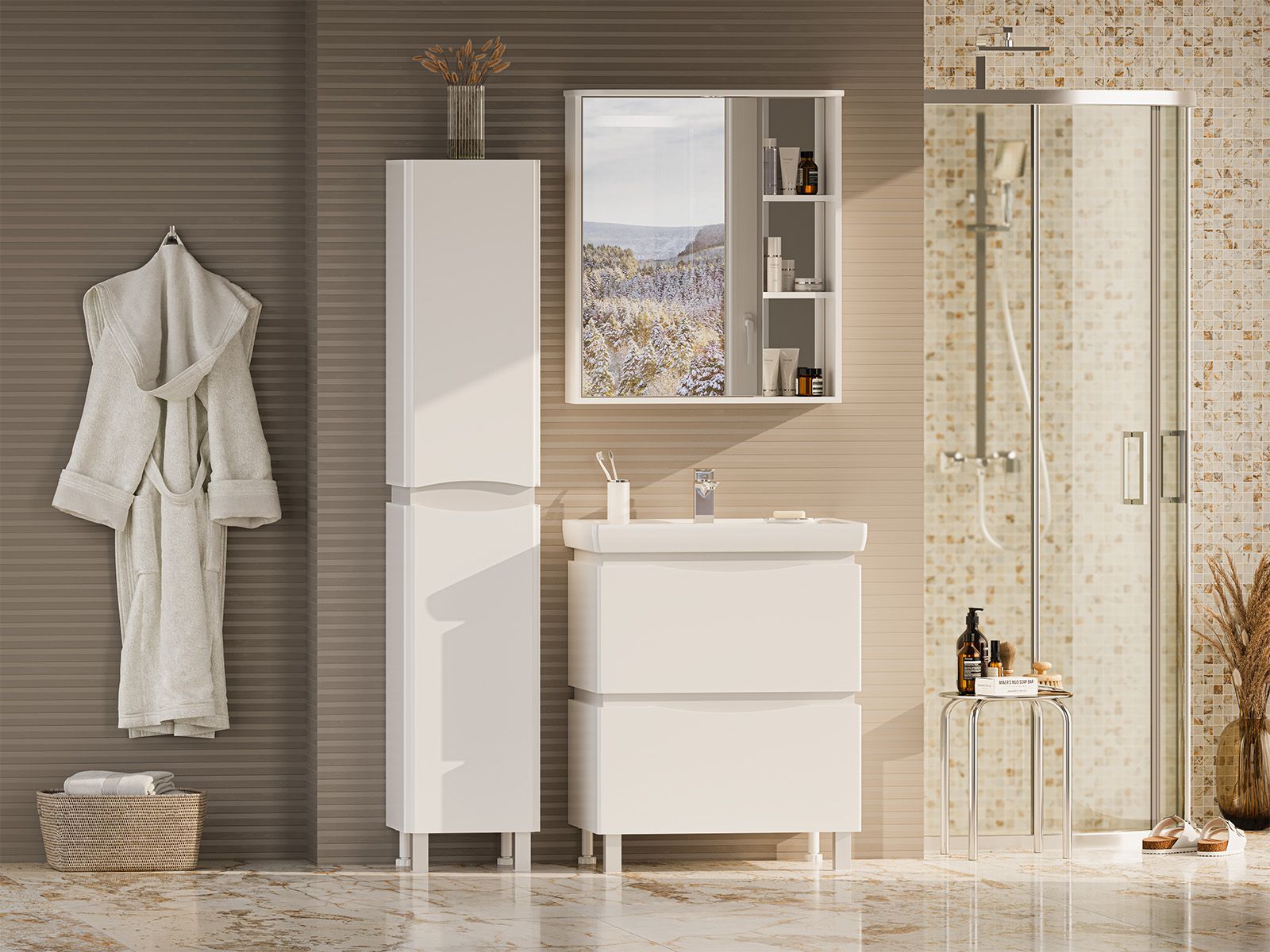 Зеркальный шкаф для ванной комнаты – это стильный акцент, который может преобразить любое пространство. С его элегантными линиями и продуманным дизайном, он идеально вписывается в современный интерьер. Внешняя поверхность шкафа, выполненная из качественных материалов, отражает свет, создавая ощущение простора и уюта.Внутреннее содержание шкафа умело организовано: разнообразные полки и отсеки позволяют удобно разместить все необходимые аксессуары – от косметики до бытовой химии. Зеркало, интегрированное в фасад, визуально расширяет пространство и облегчает утренние рутинные процедуры.Зеркальный шкаф для ванной комнаты – это идеальное сочетание красоты и практичности, которое станет незаменимым помощником в вашем дневном ритме.