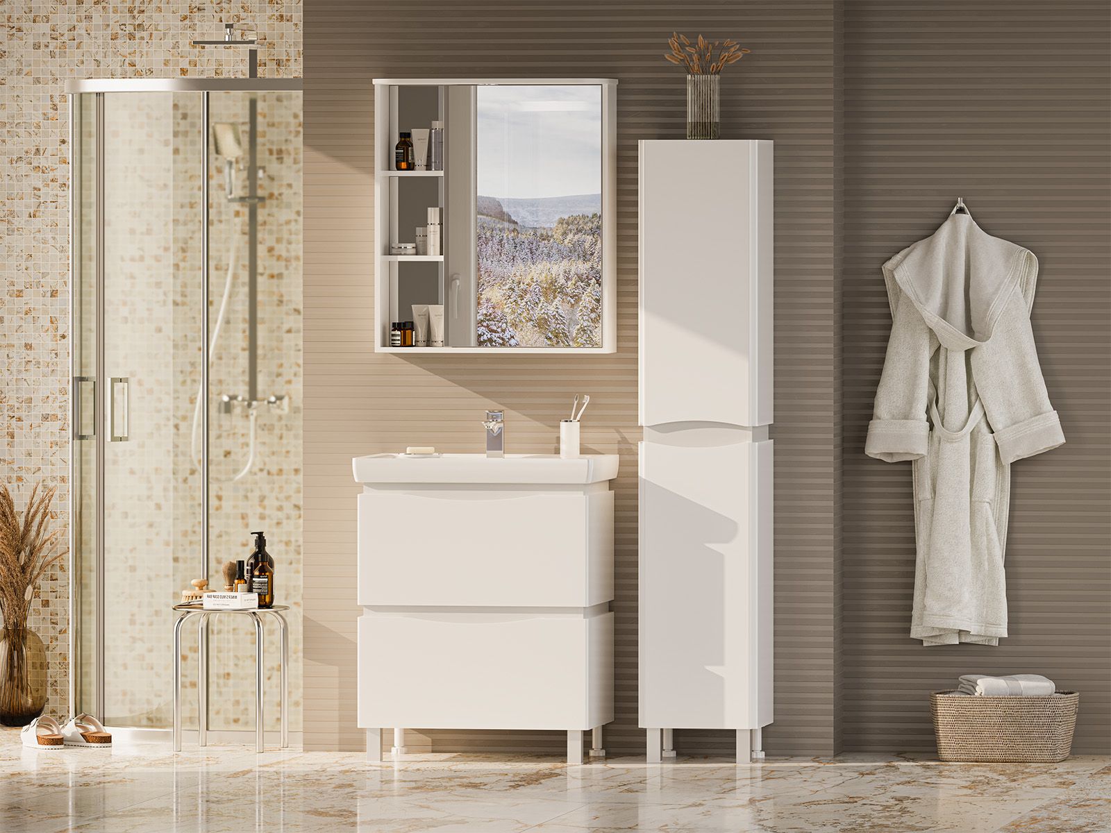 Зеркальный шкаф для ванной комнаты – это стильный акцент, который может преобразить любое пространство. С его элегантными линиями и продуманным дизайном, он идеально вписывается в современный интерьер. Внешняя поверхность шкафа, выполненная из качественных материалов, отражает свет, создавая ощущение простора и уюта.Внутреннее содержание шкафа умело организовано: разнообразные полки и отсеки позволяют удобно разместить все необходимые аксессуары – от косметики до бытовой химии. Зеркало, интегрированное в фасад, визуально расширяет пространство и облегчает утренние рутинные процедуры.Зеркальный шкаф для ванной комнаты – это идеальное сочетание красоты и практичности, которое станет незаменимым помощником в вашем дневном ритме.