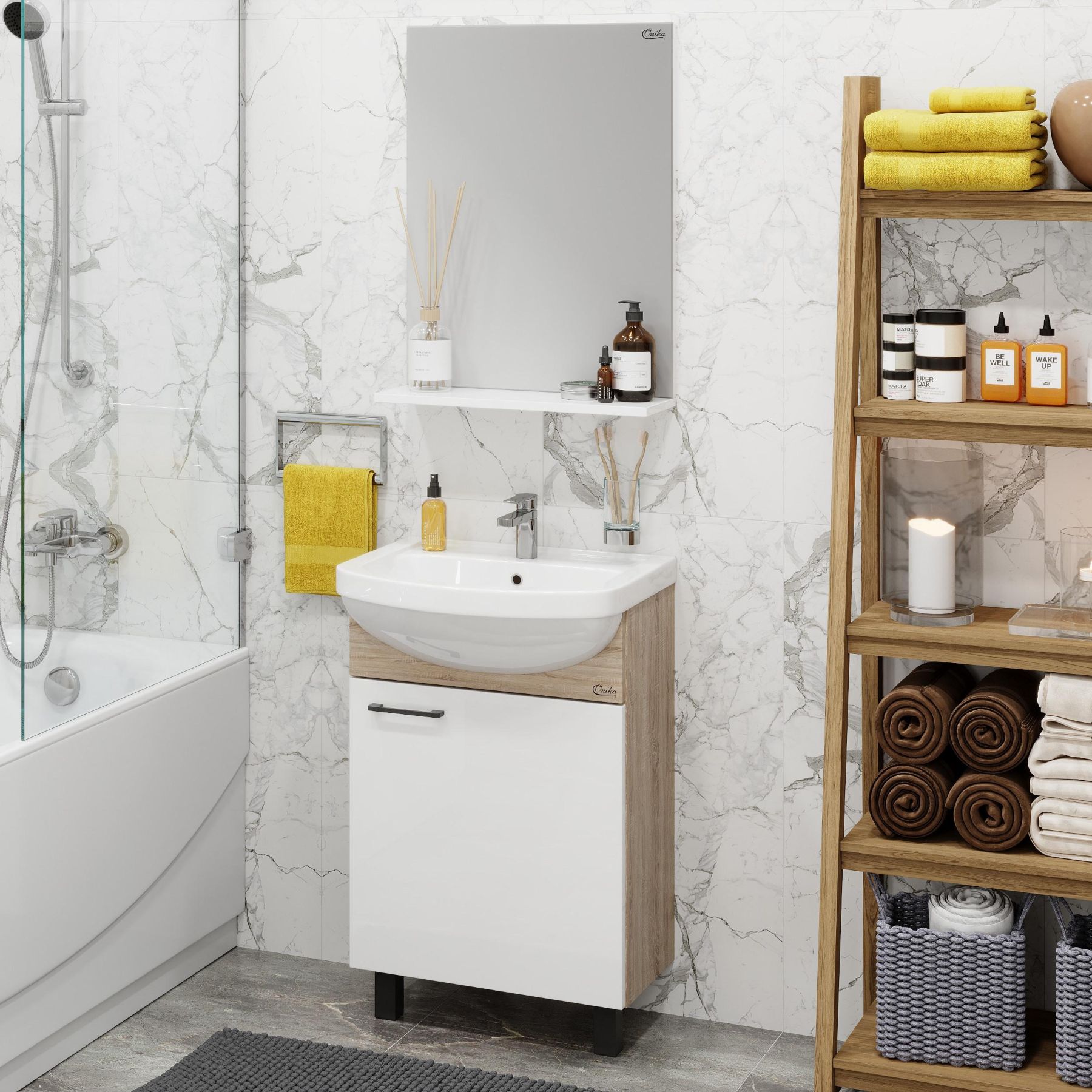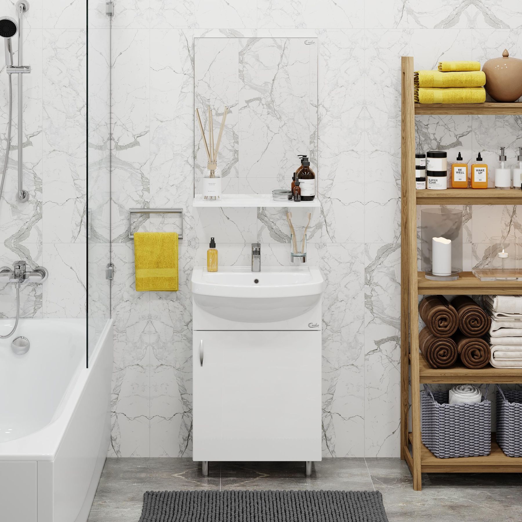 Зеркало выполнено из ЛДСП, устойчивой к механическим воздействиям, перепадам температур и высокой влажности.