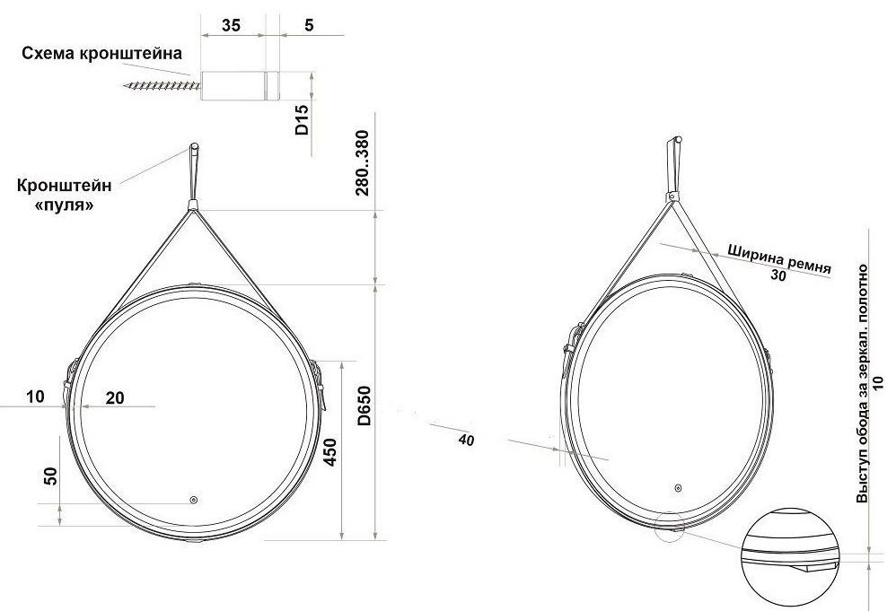 - Выступ обода за зеркальное полотно: 10 мм