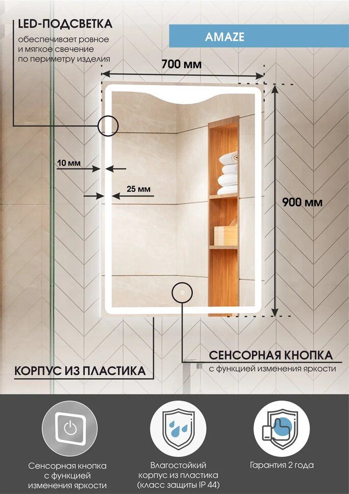 Зеркало "Amaze Led" 700х900LED подсветка 6000Ксенсорный выключатель с функцией димирования