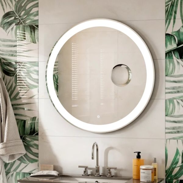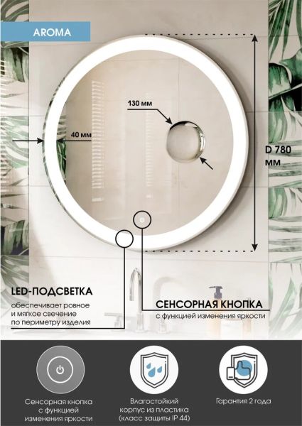 Зеркало "Aroma Led" d 780 с увеличительным зеркаломLED подсветка 6000Ксенсорный выключатель с функцией димированиявстроенное увеличительное зеркало (линза) с 3-х кратным увеличением
