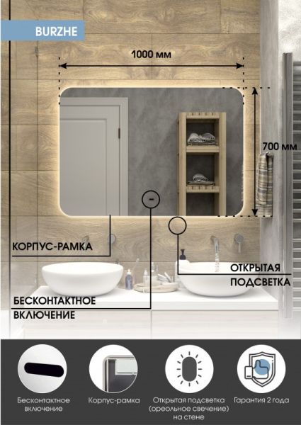 Зеркало "Burzhe Led" 1000х700 с бесконтактным сенсором, холодная подсветкаLED подсветка 6000Кбесконтактный сенсор с функцией димированияореольная подсветка