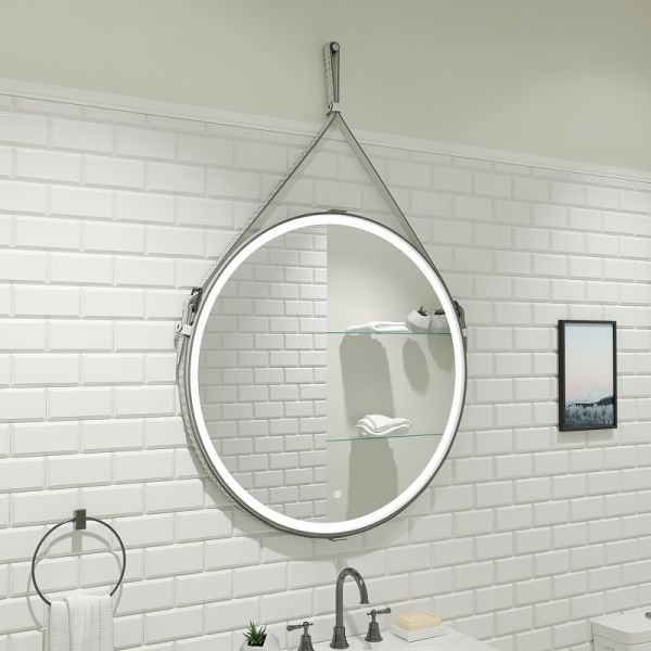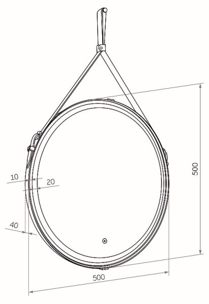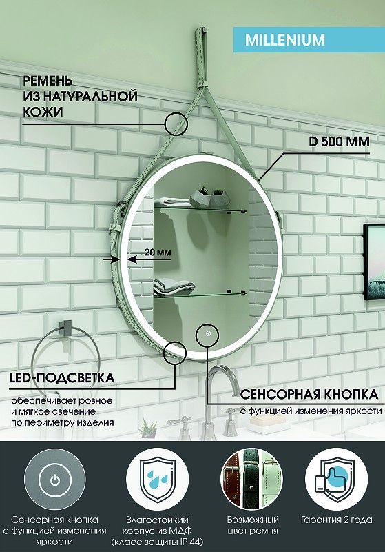 Зеркало "Millenium White Led" D 500 на ремне из натуральной кожи белого цветаLED подсветка 6000Ксенсорный выключатель с функцией димированияремень из натуркожи белого цвета