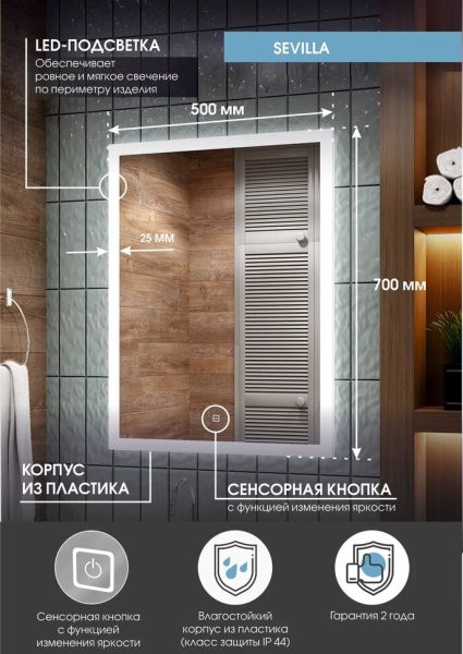 Зеркало "Sevilla Led" 500х700LED подсветка 6000Ксенсорный выключатель с функцией димирования
