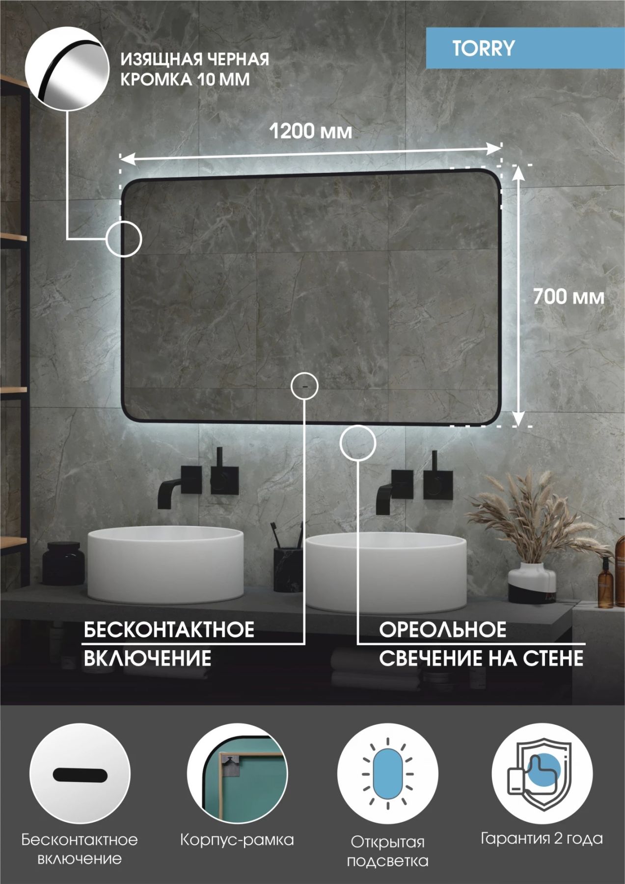 Зеркало "Torry Led" с фоновой подсветкой, бесконтактным сенсором, черной окантовкой 1200х700LED подсветка 6000К;бесконтактный сенсор с функцией димирования;открытая ореольная подсветка.