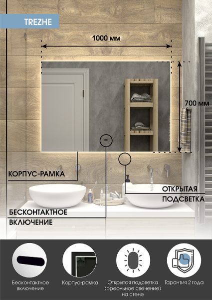 Зеркало "Trezhe Led" 1000х700 с бесконтактным сенсором, холодная подсветкаLED подсветка 6000Кбесконтактный сенсор с функцией димированияореольная подсветка