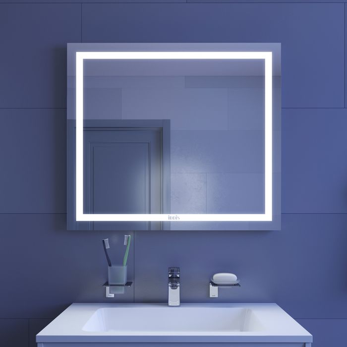На зеркальной поверхности не остается отпечатков пальцев благодаря механическому управлению светодиодной подсветкой. Выключатель спрятан на торце зеркала и невидим взгляду – активировать освещение можно простым нажатием на кнопку.