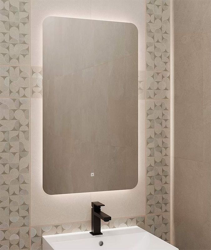 Зеркало без рамки, со скруглёнными углами и деликатной светодиодной подсветкой по периметру.